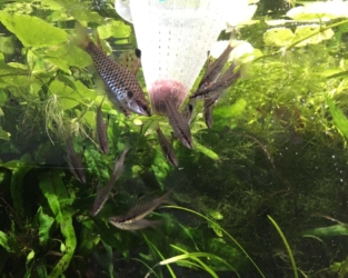 Beilbäuche, N. marginatus ( Zwergziersalmler) und A. sidthimunki ( Schachbrettschmerlen), Pangio anguilaaris ( Dornauge) und Otocinclus.